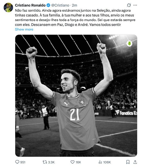C罗写道:不愿相信。就在不久前我们还在国家队一起,你刚结婚。我向你的家人、你的妻子和你的孩子们表达最深切的哀悼,并祝愿他们拥有全世界的力量。我知道你会永远与他们同在。愿你和安德烈安息。我们都会非常想念你们。
